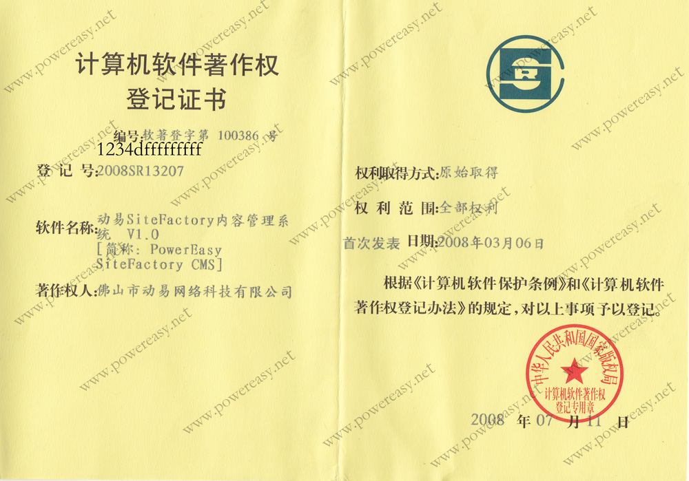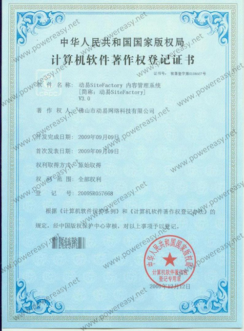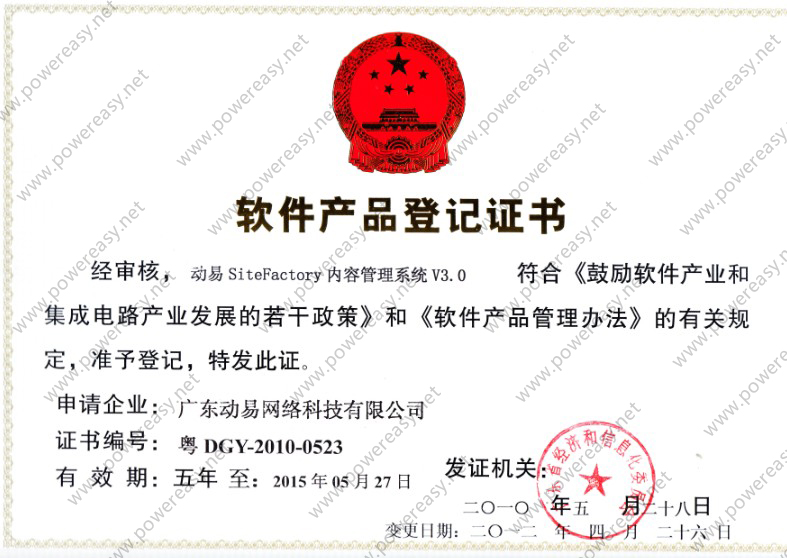 軟件產(chǎn)品登記證書 動易SiteFactory內(nèi)容管理系統(tǒng)V3.0