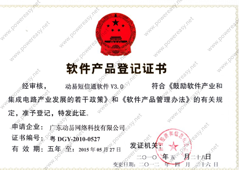 軟件產(chǎn)品登記證書 動易短信通軟件V3.0