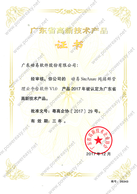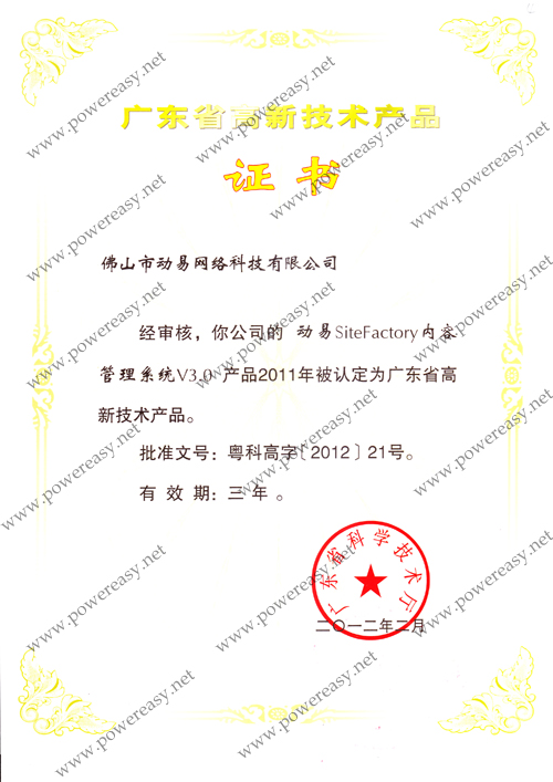 2010年廣東省高新技術(shù)產(chǎn)品 (SiteFactory)證書