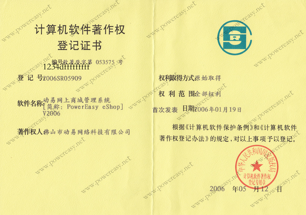 軟件產(chǎn)品登記證書 動易網(wǎng)上商城管理系統(tǒng)V2006