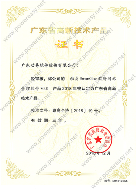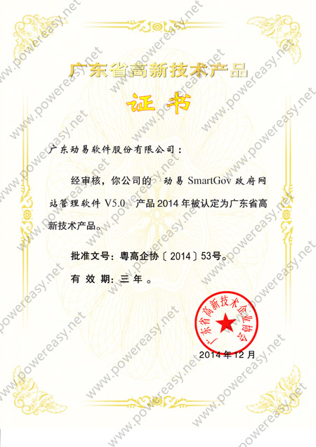 廣東省自主創(chuàng)新產(chǎn)品認(rèn)定證書 動易SmartGov V3.0
