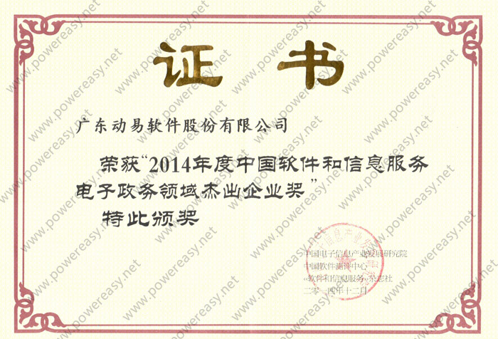 2014年度中國軟件和信息服務(wù)電子政務(wù)領(lǐng)域杰出企業(yè)獎
