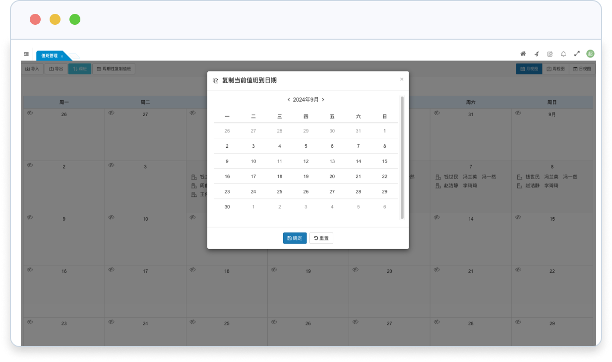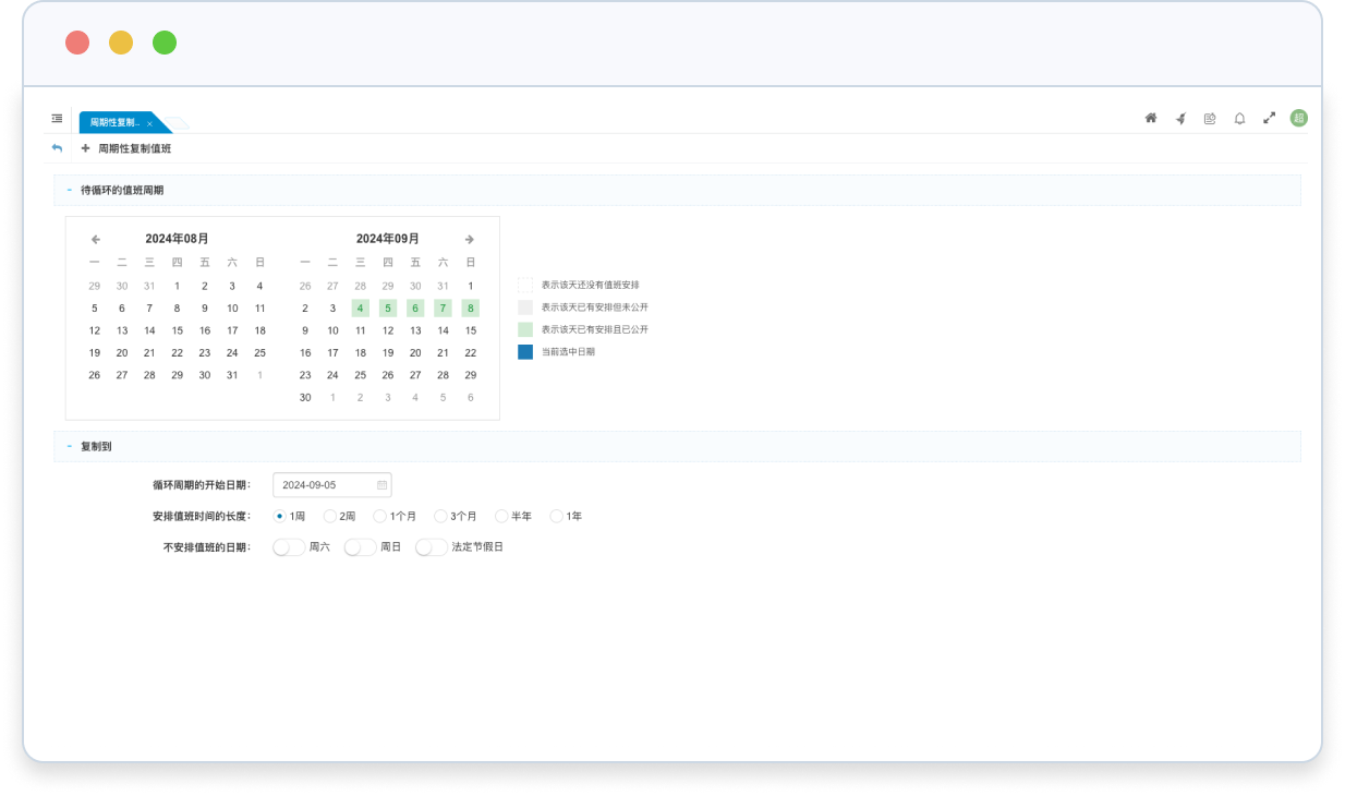 • 支持按周期復(fù)制值班功能,可快速的安排好未來(lái)一段時(shí)間的值班。