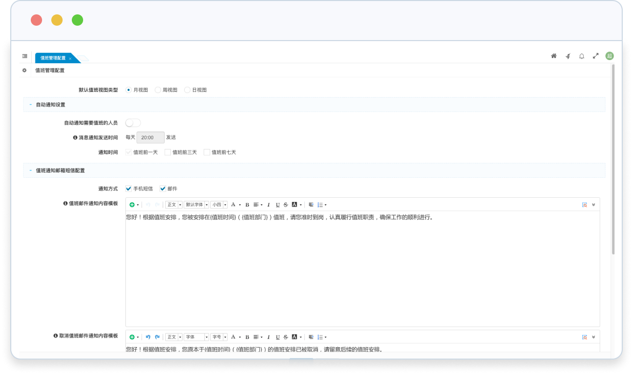 • 支持在值班前一天/三天/七天自動(dòng)給值班人員發(fā)送值班通知。通知方式支持郵件和手機(jī)短信,通知內(nèi)容支持自定義。