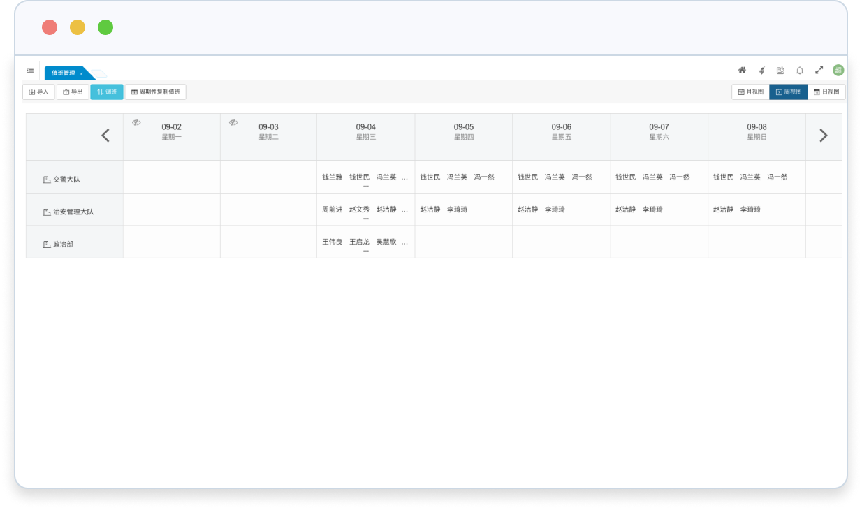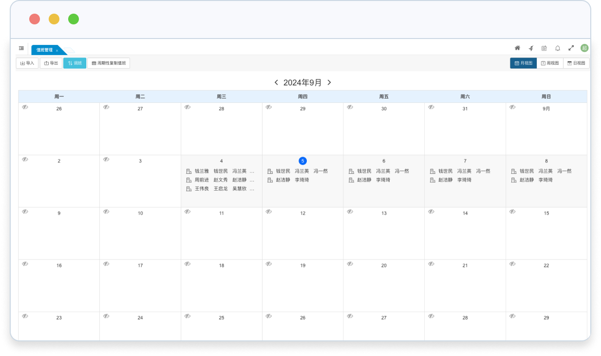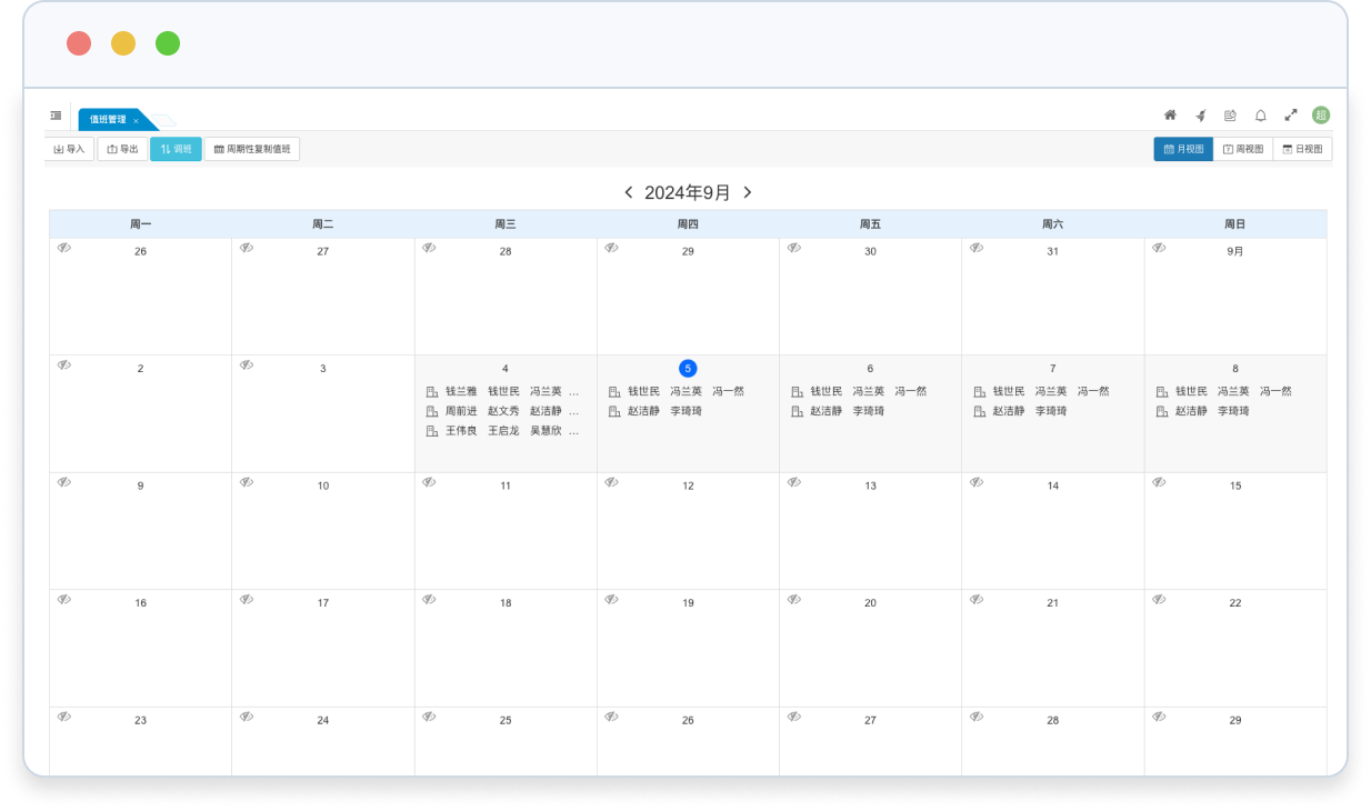 • 支持按日視圖、月視圖模式和周視圖模式對(duì)值班信息進(jìn)行管理,不同視圖適用于不同值班人員規(guī)模的排班需求。