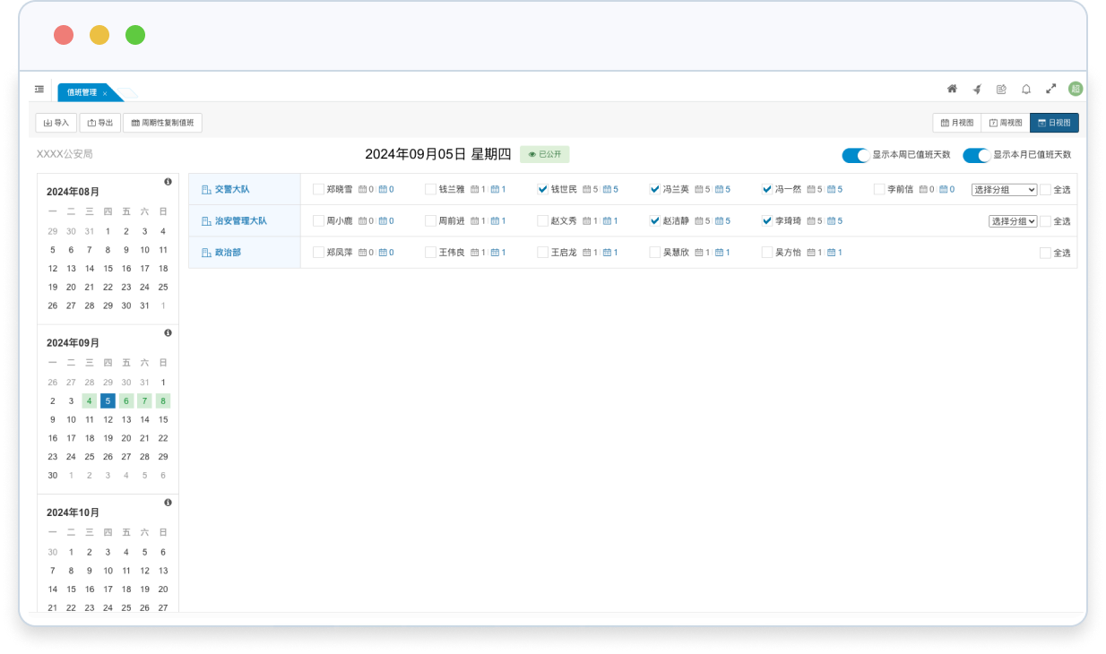• 排班時(shí),支持按日期為每個(gè)部門(mén)設(shè)置值班人員,支持在設(shè)置值班人員時(shí)直觀查看有關(guān)人員的當(dāng)周值班情況和當(dāng)月累計(jì)值班天數(shù),以幫助排班人員做出更好的決策。