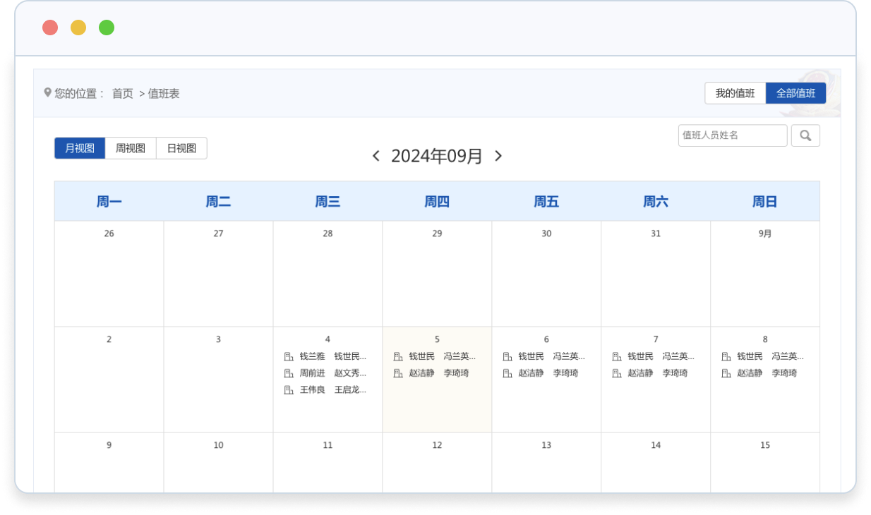 • 值班信息列表頁(yè)與后臺(tái)相同,提供月視圖模式來(lái)顯示每月的值班信息,提供周視圖模式來(lái)展示每周的值班信息,提供日視圖來(lái)查看指定日期的值班表,并且支持在月視圖、周視圖、日視圖之間自由切換。用戶還可以從月視圖或周視圖中點(diǎn)擊查看特定日期的值班表,支持按人名搜索值班安排,且能夠同時(shí)搜索多個(gè)人。