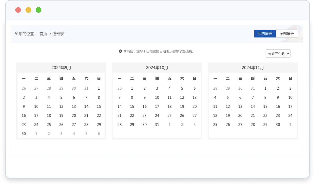 • 支持“我的值班”,當(dāng)用戶已登錄時(shí),可訪問(wèn)“我的值班”頁(yè)面,頁(yè)面以日歷方式顯示當(dāng)前用戶的值班安排。