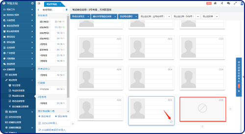 筆試考生管理的界面與報(bào)名管理類似,中欄為本次招生考試項(xiàng)目的班級(jí)列表,每個(gè)班級(jí)名稱后顯示相應(yīng)的進(jìn)入筆試流程的考生總數(shù),假如有“待安排座位”的考生,則用紅點(diǎn)進(jìn)行提醒。中欄頂部支持切換招生考試項(xiàng)目。