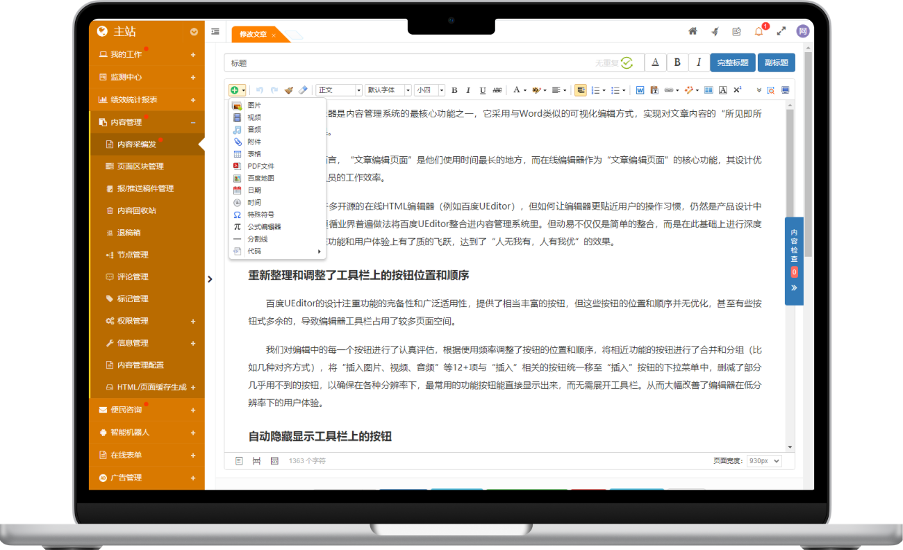 盡管市面上有許多開源的在線 HTML 編輯器(例如百度 UEditor),但如何讓編輯器更貼近用戶的操作習(xí)慣,仍然是產(chǎn)品設(shè)計(jì)中的一個(gè)挑戰(zhàn)。動(dòng)易遵循業(yè)界普遍做法將百度 UEditor 整合進(jìn)內(nèi)容管理系統(tǒng)里。但動(dòng)易不僅僅是簡(jiǎn)單的整合,而是在此基礎(chǔ)上進(jìn)行深度改進(jìn)和優(yōu)化,從而在功能和用戶體驗(yàn)上有了質(zhì)的飛躍,達(dá)到了“人無我有,人有我優(yōu)”的效果。