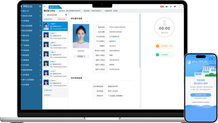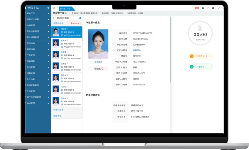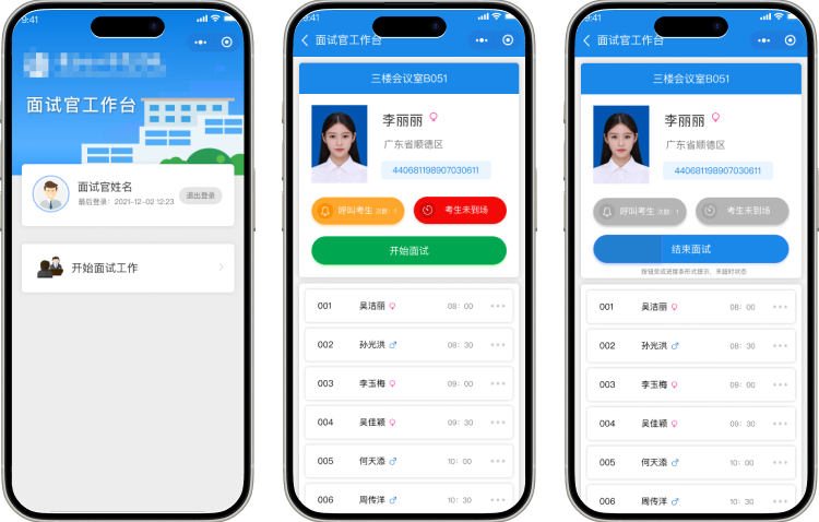 面試官工作臺(tái)支持叫號、考生未到場處理、開始面試、結(jié)束面試、錄入面試結(jié)果等操作,并提供倒計(jì)時(shí)及超時(shí)提醒功能。