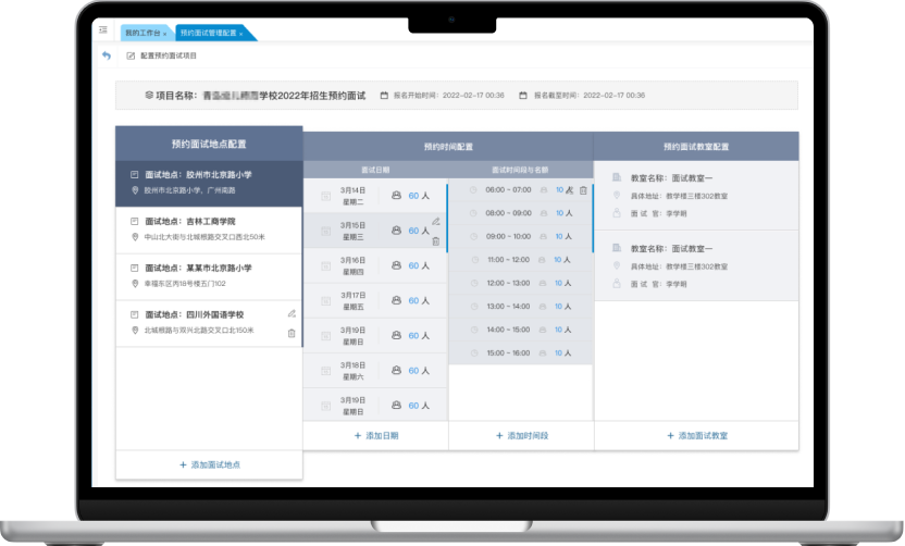 可配置每位考生的面試時(shí)長,并設(shè)定面試項(xiàng)目的地點(diǎn)、日期、時(shí)間段、面試教室和面試官等參數(shù)。