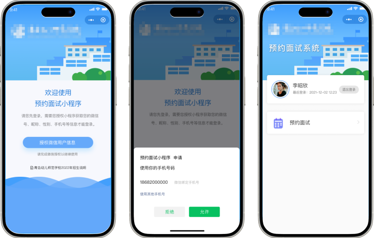 學(xué)校通過網(wǎng)站、微信公眾號、微信群等方式發(fā)布招生簡章,學(xué)生及家長收到通知后,可掃描二維碼進(jìn)入小程序。小程序自動(dòng)獲取當(dāng)前微信綁定的手機(jī)號進(jìn)行注冊和登錄。成功登錄后,進(jìn)入招生面試管理系統(tǒng)小程序的主頁。