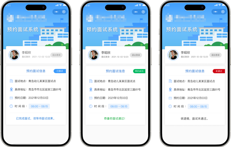 系統(tǒng)在預(yù)約面試日期前三天、前一天、預(yù)約當(dāng)天,以及預(yù)約時(shí)間段的前3小時(shí),分別發(fā)送提醒通知,確??忌磿r(shí)到達(dá)面試現(xiàn)場。