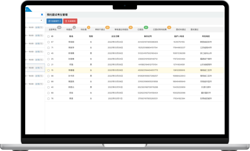 預(yù)約面試系統(tǒng)相比招考管理系統(tǒng),減少了組織筆試相關(guān)的功能模塊(如科目管理、考點(diǎn)管理、考場管理、座位管理、座位安排、筆試成績錄入等),也沒有面試日程表功能。但它增加了考生報(bào)到、查看排隊(duì)情況、以及叫號大屏幕等功能,專門針對大規(guī)模人員面試業(yè)務(wù)場景的需求進(jìn)行了優(yōu)化。