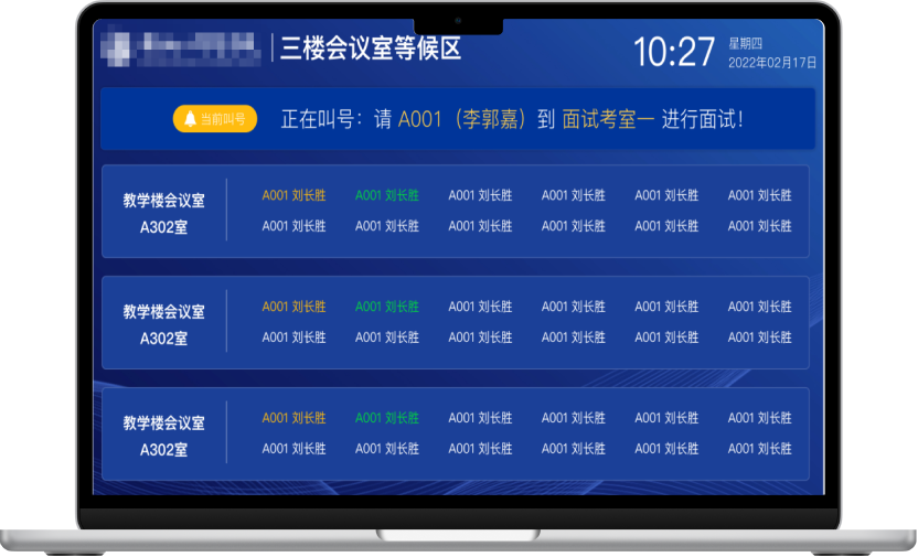類似醫(yī)院的候診大屏幕設(shè)計(jì),系統(tǒng)設(shè)計(jì)了專門的叫號大屏幕,實(shí)時(shí)展示并播報(bào)正在叫號的考生信息,同時(shí)顯示各面試教室中已排隊(duì)考生的序號,方便考生及時(shí)到達(dá)指定面試教室等候面試。