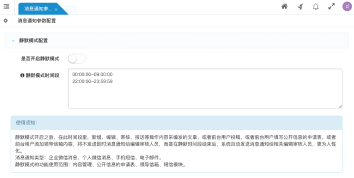 開啟靜默模式后,在設(shè)定的靜默時間段內(nèi),大部分業(yè)務(wù)場景所產(chǎn)生的消息通知將暫停向相關(guān)人員發(fā)送,例如新增、編輯、審核、報送等操作,以及前臺用戶的投稿、公開信息申請表的填寫、信訪寫信等等。靜默時間段結(jié)束后,系統(tǒng)將自動發(fā)送消息通知給有關(guān)人員,以減少在靜默時段內(nèi)對管理員的打擾。