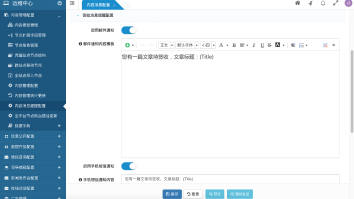 支持有待審核內(nèi)容時自動通知管理員。編輯人員采用稿件或退稿時自動通知投稿人。支持開啟/關(guān)閉通知功能,并支持配置通知內(nèi)容模板。