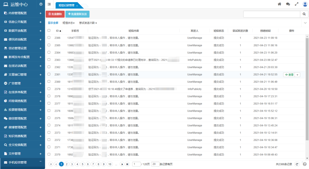 支持對(duì)短信發(fā)送記錄進(jìn)行查看、篩選、搜索、刪除等功能,支持對(duì)短信進(jìn)行重發(fā)等功能。