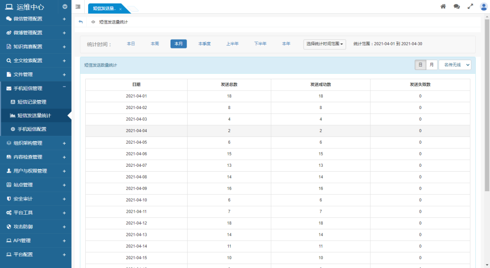 提供按日和按月兩種統(tǒng)計(jì)表。統(tǒng)計(jì)每日/每月發(fā)送的短信發(fā)送總量、發(fā)送成功數(shù)量、發(fā)送失敗數(shù)量。便于與短信服務(wù)商進(jìn)行對(duì)帳。