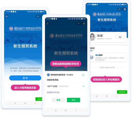 新生報到的學(xué)生端通過微信小程序?qū)崿F(xiàn)。學(xué)生到校后,掃描學(xué)校公布的小程序二維碼,進(jìn)入小程序。小程序會自動獲取當(dāng)前微信綁定的手機(jī)號,并與新生報到數(shù)據(jù)進(jìn)行匹配。