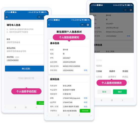如果手機(jī)號未能與系統(tǒng)中的新生數(shù)據(jù)匹配,系統(tǒng)將提示學(xué)生在小程序頁面中填寫【姓名+身份證號+原手機(jī)號】進(jìn)行數(shù)據(jù)匹配。匹配成功后,進(jìn)入個人信息核對步驟。