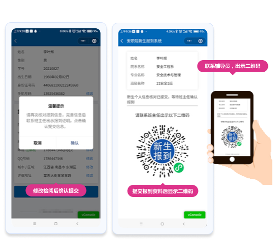 如果匹配成功,系統(tǒng)將顯示學(xué)生的院系、專業(yè)、班級、個人信息等內(nèi)容。新生需核對個人信息,如有誤,可以根據(jù)實(shí)際情況進(jìn)行修改,并提交更改。系統(tǒng)會彈出確認(rèn)信息窗口,點(diǎn)擊【確認(rèn)提交】按鈕后,系統(tǒng)會根據(jù)學(xué)生的身份證和當(dāng)前時間生成一個二維碼。