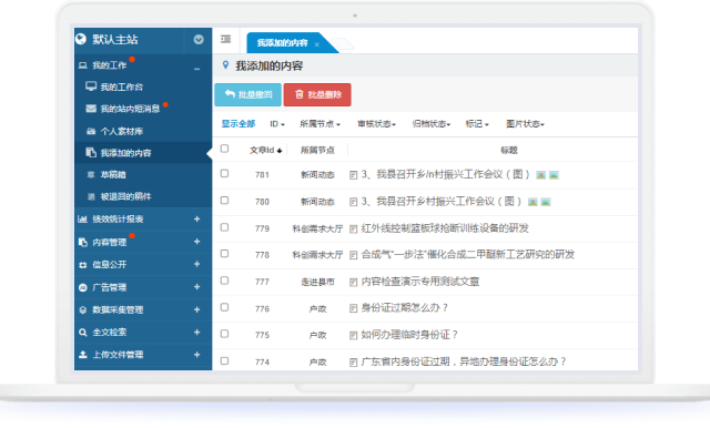 當有被退回稿件時,菜單項名稱上會顯示紅點提醒標記,同時,相應內(nèi)容模型圖標也會顯示紅點標記以作提醒。