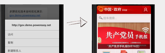 現(xiàn)如今,我們?cè)絹?lái)越多的會(huì)通過(guò)短信、微信或者郵件分享一個(gè)產(chǎn)品鏈接、一條有趣的新聞,而當(dāng)我們點(diǎn)擊這些鏈接打開時(shí),如果是其他技術(shù),在手機(jī)中顯示的就是原pc界面,而多屏優(yōu)化后就顯示專為手機(jī)優(yōu)化的界面,實(shí)現(xiàn)全時(shí)優(yōu)化。