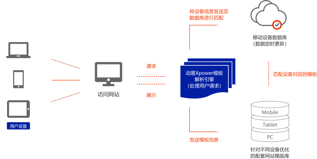 動易獨(dú)創(chuàng)的多屏優(yōu)化技術(shù),可在保持同一域名、同一后臺、同一數(shù)據(jù)庫、同一套系統(tǒng)的基礎(chǔ)上,不同設(shè)備(如PC、手機(jī)、PAD)來訪問網(wǎng)站時,網(wǎng)站都會針對此類設(shè)備顯示與之最相適應(yīng)和專為此類設(shè)備的用戶使用習(xí)慣優(yōu)化的前端界面。