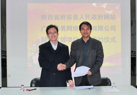 (動(dòng)易軟件公司董事長(zhǎng)、總裁粟維勝先生和府谷縣人民政府網(wǎng)站負(fù)責(zé)人李鵬簽訂合作協(xié)議)