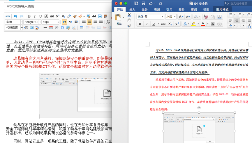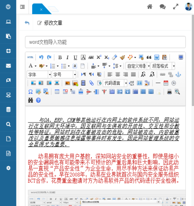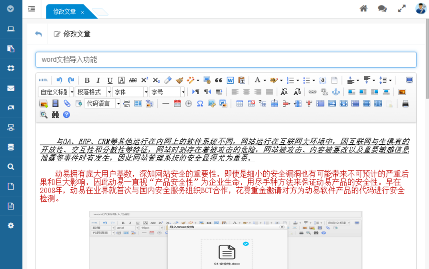 全新架構(gòu)的動(dòng)易SiteAzure 支持在線導(dǎo)入 Word 文檔,系統(tǒng)將自動(dòng)對(duì)文檔內(nèi)容、字體格式、排版進(jìn)行識(shí)別并保留 Word 文檔樣式,可在內(nèi)容編輯器中可視化展示;同時(shí),Word 文檔中的圖片、表格等文件將自動(dòng)上傳直接顯示在編輯器里,用戶可以在編輯器中繼續(xù)編輯或排版,也可以無需編輯排版而直接發(fā)布。發(fā)布的文章在網(wǎng)站前臺(tái)展示的效果和 Word 文檔中的效果一致。
