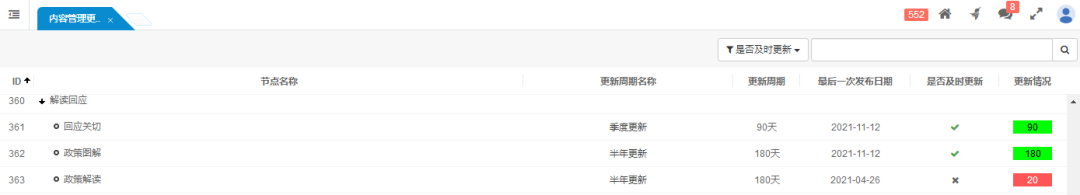 系統(tǒng)提供了監(jiān)測中心及績效統(tǒng)計報表功能,可以對政策文件\政策解讀的發(fā)布情況進行統(tǒng)計、對更新情況進行日常監(jiān)測。此外,系統(tǒng)還提供內容更新預警功能,擁有權限的管理員可以收到信息提醒通知。