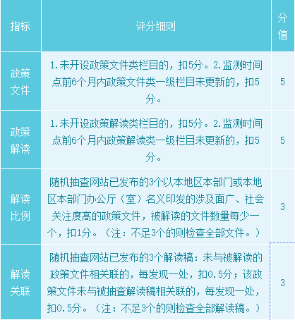 政策解讀是政府網站績效考核的一個重要部分,涉及考核分值16分(政策文件+政策解讀+解讀比例+解讀關聯(lián))。關于政策解讀的主要內容, 在2019年4月1日 《國務院辦公廳秘書局關于印發(fā)政府網站與政務新媒體檢查指標、監(jiān)管工作年度考核指標的通知》可以看到: