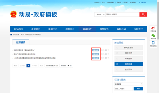 解讀材料上應隨政策文件同步在政府網站予以公開發(fā)布。在動易系統(tǒng)中,管理員發(fā)布政策解讀時,可將解讀材料和被解讀的政策文件相互關聯(lián)。