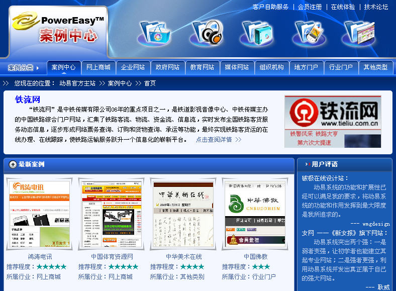 新版“案例中心”將繼續(xù)關注互聯(lián)網(wǎng)網(wǎng)站應用的走向趨勢,努力打造成一個推廣動易系統(tǒng)優(yōu)秀應用范例的交流平臺。其入選的案例將進行精心篩選,更注重考量動易產(chǎn)品應用水平與網(wǎng)站界面設計的質(zhì)量,力求將各類優(yōu)秀的、具有借鑒性、參考價值的案例介紹給大家,使得案例中心成為廣大動易用戶案例展示、互相學習、共同進步的平臺。