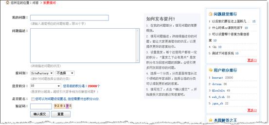 提問頁面與國內(nèi)知名的百度知道、新浪愛問相似,均支持標(biāo)題、內(nèi)容描述、分類選擇、積分懸賞、匿名設(shè)定、以及驗證碼等各項主要內(nèi)容。目前不提供上傳圖片的問題支持,這是因為如果開放傳圖就會涉及安全、頁面樣式破壞等問題,而目前一般的問答如百度等都沒有對圖片進(jìn)行支持。