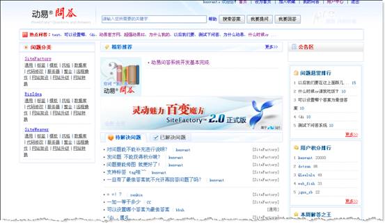 通過上圖我們可以發(fā)現(xiàn),目前動易問答系統(tǒng)功能已經(jīng)基本完整了。從最頂部的“會員登錄”、“我的問答”到“我要提問”、“我要回答”等功能均已完成;同時也已經(jīng)完成了“問題兩級分類”、“待解決問題”與“已解決問題”區(qū)分,“用戶積分排名”、“本周解答之王”、“問題懸賞排名”等我們常見的問答功能模塊。一句話,這個預(yù)覽版已經(jīng)頗具規(guī)模!