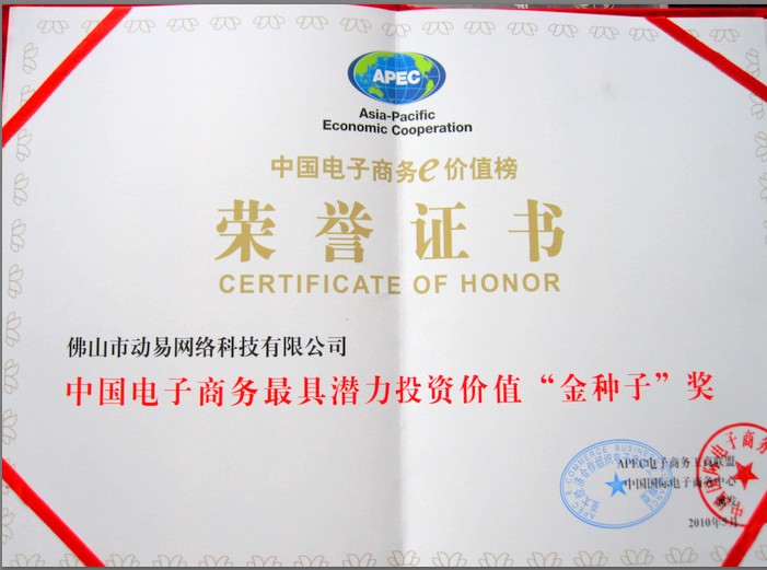 2010年5月21日,由APEC(亞太經(jīng)濟合作組織)和中華人民共和國商務部在四川成都主辦的“第四屆APEC電子商務工商聯(lián)盟論壇”傳出喜訊,按照“成長性、創(chuàng)新性、影響力和經(jīng)典案例”等四項評選標準,經(jīng)組委會嚴謹評定,作為“全程式電子商務解決方案”的開創(chuàng)者,國內(nèi)最大的網(wǎng)站管理系統(tǒng)提供商,動易公司榮膺“中國電子商務最具潛力投資價值‘金種子獎’”!。