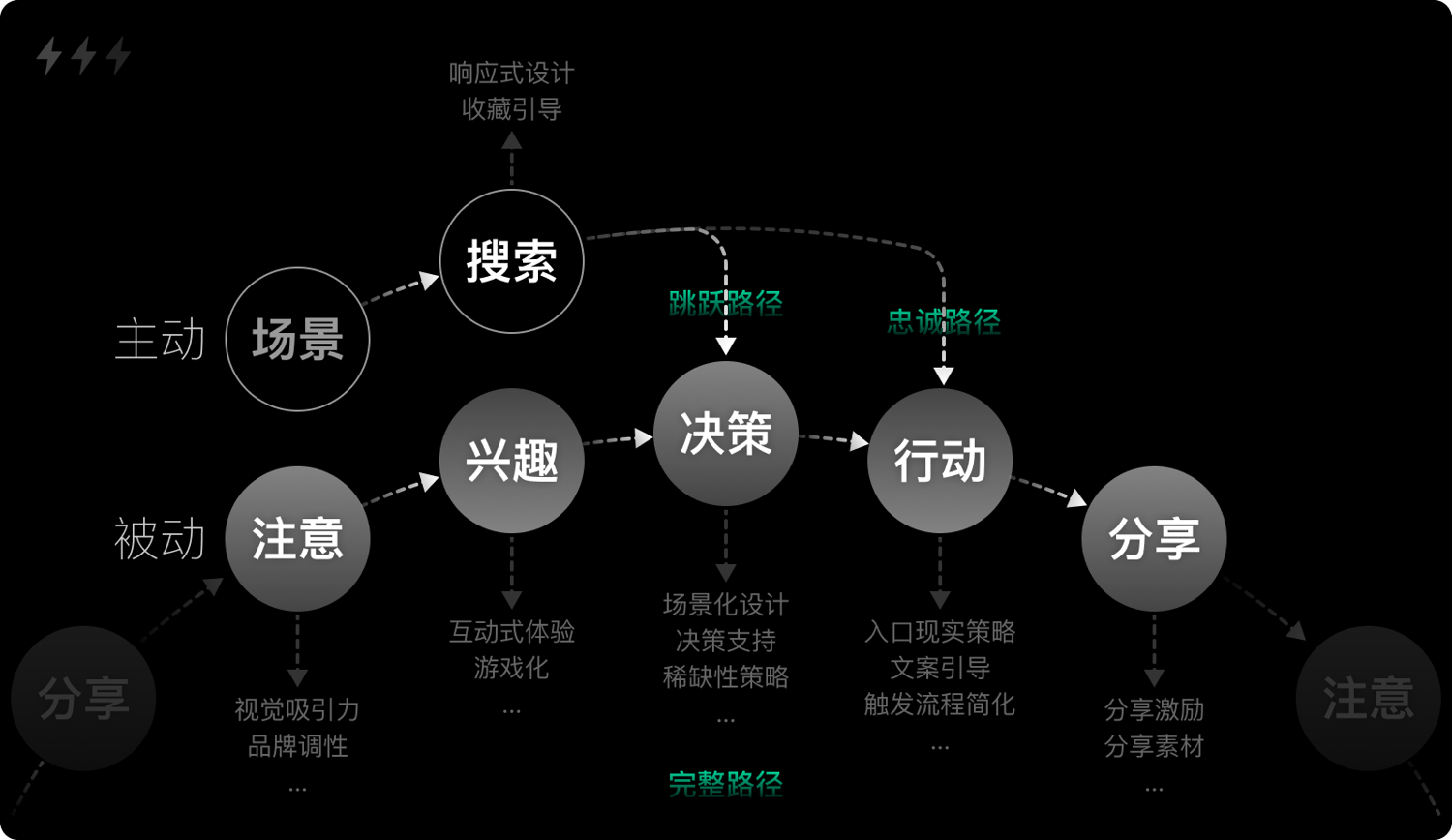 在充分借鑒多個(gè)模型的基礎(chǔ)上,并結(jié)合線(xiàn)上用戶(hù)和場(chǎng)景特點(diǎn),梳理出一個(gè)我認(rèn)為更符合數(shù)字消費(fèi)者行為特點(diǎn)的決策模型。該模型同CDJ模型相似,采取環(huán)狀流程,以主動(dòng)型和被動(dòng)型兩類(lèi)用戶(hù)為出發(fā)點(diǎn),由“完整路徑”“跳躍路徑”“忠誠(chéng)路徑”三個(gè)部分組成,包括了注意、興趣、決策、行動(dòng)和分享等五個(gè)關(guān)鍵節(jié)點(diǎn)。