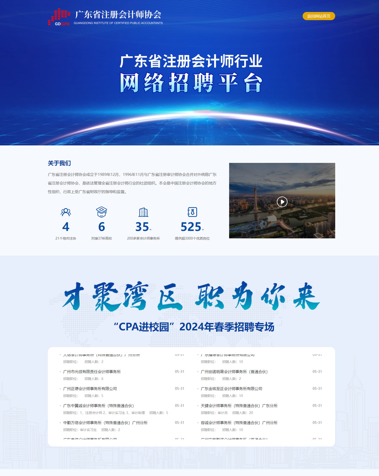 廣東省注冊(cè)會(huì)計(jì)師行業(yè)網(wǎng)絡(luò)招聘平臺(tái)是聯(lián)合全省21個(gè)地市注協(xié)搭建的“一站式”垂直招聘平臺(tái),專(zhuān)注于注冊(cè)會(huì)計(jì)師行業(yè)的招聘,服務(wù)全省近1100家會(huì)計(jì)師事務(wù)所,為全國(guó)大學(xué)畢業(yè)生提供注冊(cè)會(huì)計(jì)師行業(yè)的招聘信息,實(shí)現(xiàn)精準(zhǔn)匹配。
